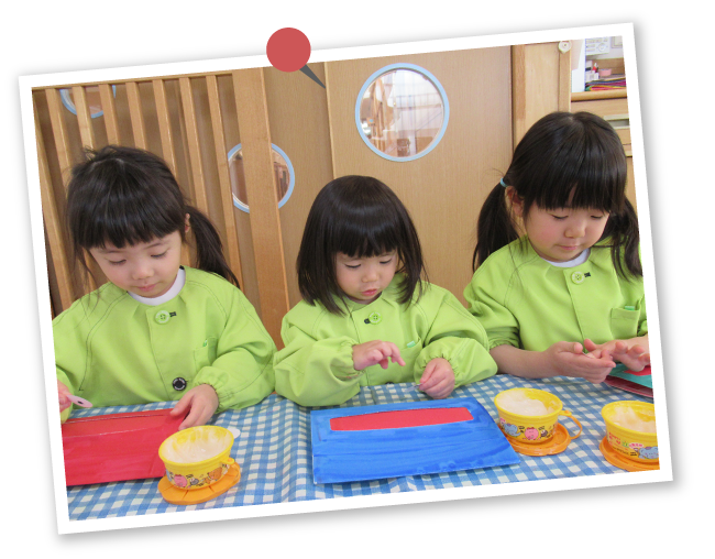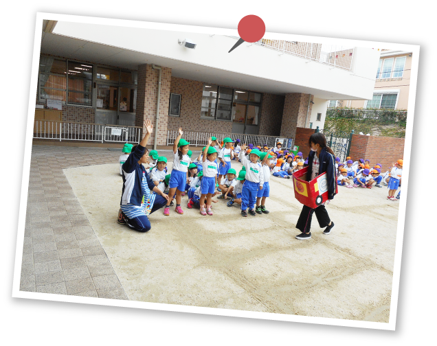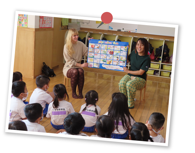 ネイティブスピーカーの先生2人に来ていただき、5歳児 さんが週1回、歌やゲーム、絵カード等を使用しながら “遊び”の中で英語に触れコミュニケーションを楽しんでいます。
