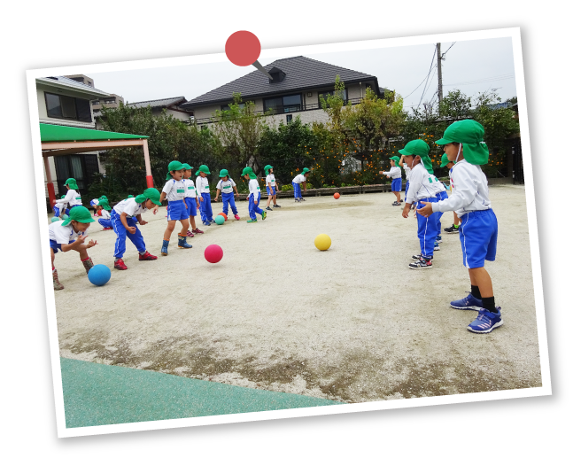 毎朝の体操をはじめ主活動内での体育遊びや鬼ごっこ、 ボール遊びや固定遊具での活動。3歳以上児さんは、週1回の体育指導の先生とマットや跳び箱、鉄棒等の運動な ど年間を通して多彩な内容によって脚力や腕力、バランス力、敏捷性や柔軟性などを育成します。